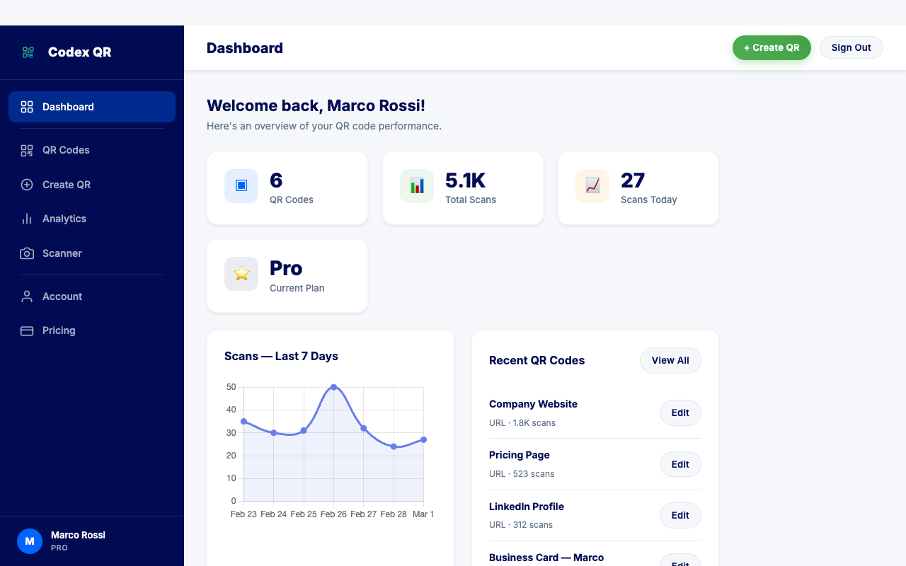 Go to app.codexqr.com and create a free account. No credit card is required. The free plan includes up to 5 dynamic QR codes with full analytics and landing pages.